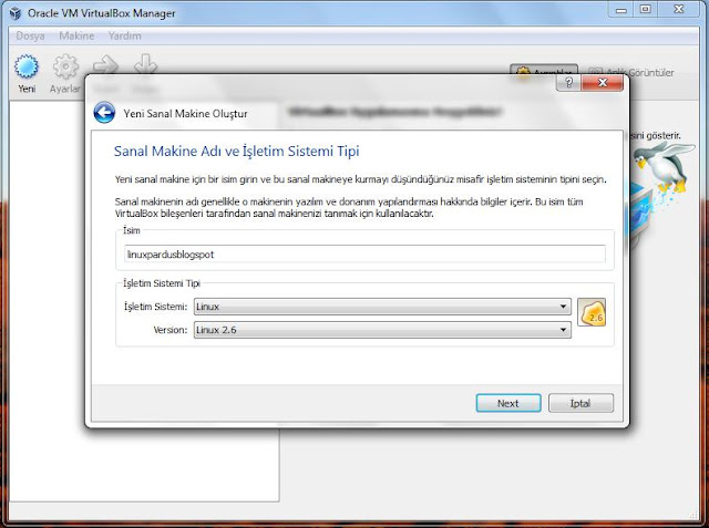 Yeni bir sanal makine eklemek için sol üstten Yeni diyerek Next diyoruz ve sanal makinemize vereceğimiz isim ekranı karşımıza geliyor. Burada sanal makinemize uygun bir isim verirsek hemen altaki listede var ise otomatik seçilecektir (isim alanına Ubuntu yazarsanız demek istediğim anlaşılacaktır) ancak listede Pardus olmadığı için ve Pardus'un 2.6 serisi kernel kullandığını bildiğimiz için Linux/Linux 2.6'yı seçelim. Eğer bilmiyor olsaydık Other Linux'u seçecektik. Bu seçim ekranı bellek, görüntü belleği ve sabit disk gibi konularda bize ipucu vermesinin yanı sıra bazı özellikleri de ayarladığı için doğru olana en yakın seçeneği seçmek biraz önemli. 32-64 bit seçimi ise en önemli konu. Vereceğimiz isim keyfi olarak herhangi bir şey olabilir.