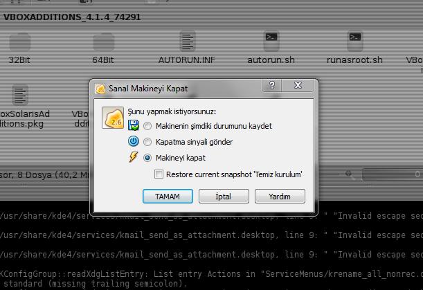 Kurulum bitti. Ve masaüstü karşımızda. Şimdi benim önerim olarak yapmamız gereken makinenin bu halinin bir anlık görüntüsünü almak. Bu sayede istediğimiz an yeni kurulmuş bir Pardus'umuz olacak. İstediğimiz değişiklikleri yaptıktan sonra memnun kalmazsak aynen geri döneriz, memnun kalırsak tekrar görüntü alırız. Bu kadar basit ve kolaylaştırıcı. Bunun için sağ Ctrl + T'ye basıp anımsatıcı bir isim ve açıklama yazmamız yeterli. Artık sanal makine penceremizi kapatırken onay kutusu halinde bize o duruma dönmeyi isteyip istemediğimizi soracak. Ve ana pencerede herhangi bir anlık görüntüden başlayabilme seçeneğimiz etkin olacak. Ayrıca bu anlık görüntüleri sanal sabit disk haline getirebilme imkanımız da var.